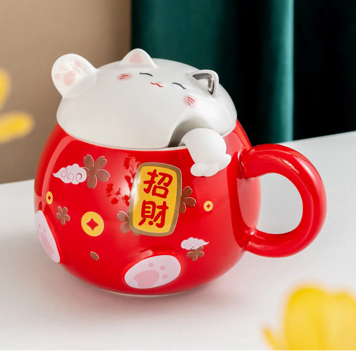 Fortune Cat 15oz Mug with Lid and Spoon quantity