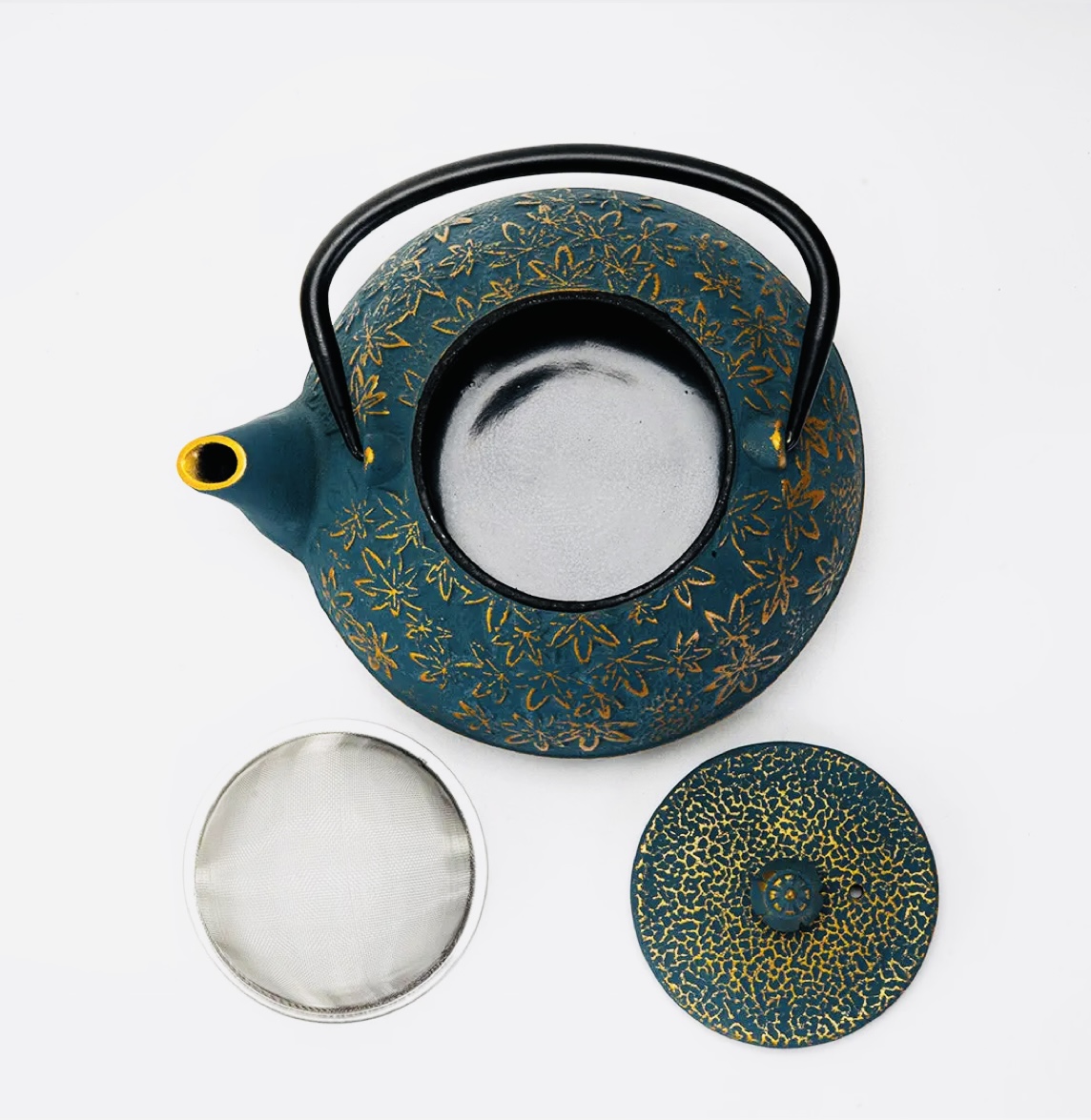 Turquoise Maple Leaves Momiji Design 40oz Cast Iron Tea Pot